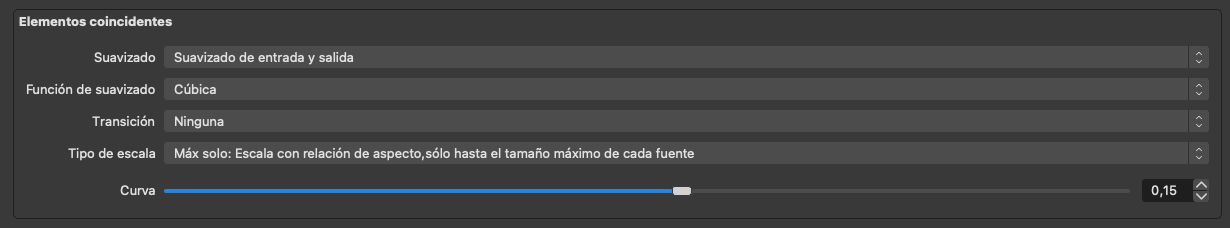 Las opciones son las mismas en los tres grupos, y aquí se configura la transición que hará cada tipo de elemento, y si esta debe de curvar los elementos durante su transición.