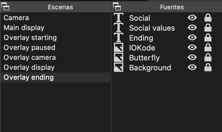 En OBS, una escena se compone de objetos de fuente, y a su vez una escena es también uno de estos objetos. Estos objetos pueden ser entradas de vídeo, de cámara, texto, una escena, etc., sin embargo, es importante entender que estos objetos no pertenecen a la escena que lo contienen, si no que existen de forma global y estos son referenciados desde las escenas que los utilizan.